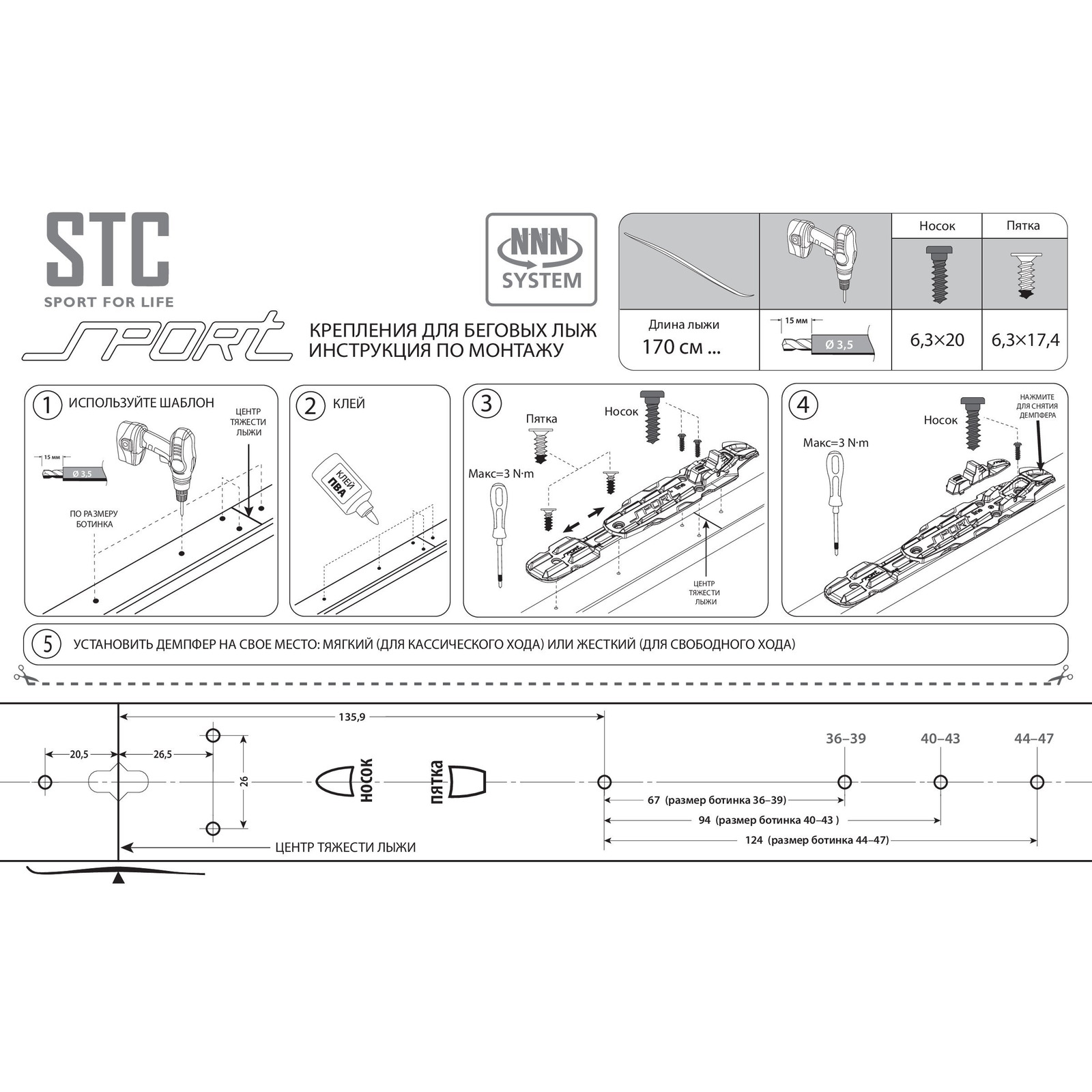 Лыжные гоночные механические крепления предназначены для лыжников любого уровней катания. Надежные крепления системы NNN. Крепления рассчитаны на размер ботинка с 36 по 47. Крепления NNN удобны в использовании, пятку в креплениях можно передвигать на любой размер обуви. В передней части крепления расположены резиновые упоры (их обычно называют "флексоры"). При толчке именно в "флексор" упирается носок ботинка. Способ установки на шурупы. Стиль катания коньковый.