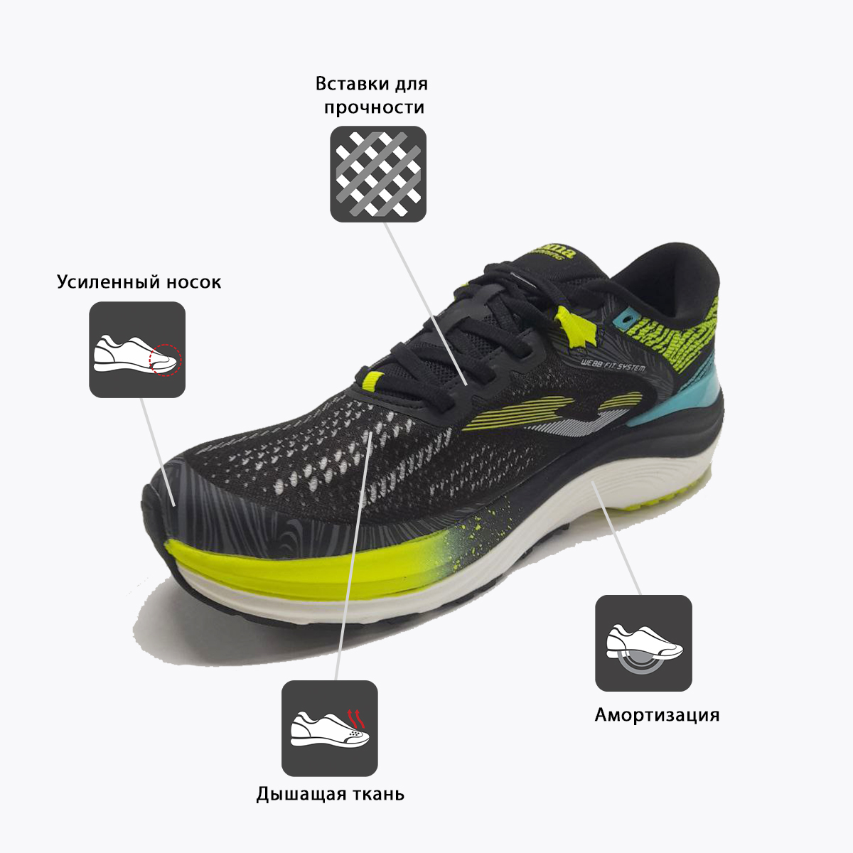 JOMA Fenix – кроссовки для бега с отличной амортизацией. Могут быть использованы, как для ежедневных тренировок, так и восстановительных пробежек и снятий усталости ног после соревнований. Предназначены для бегунов с нейтральной пронацией среднего и большого веса, от 70 до 90 кг.